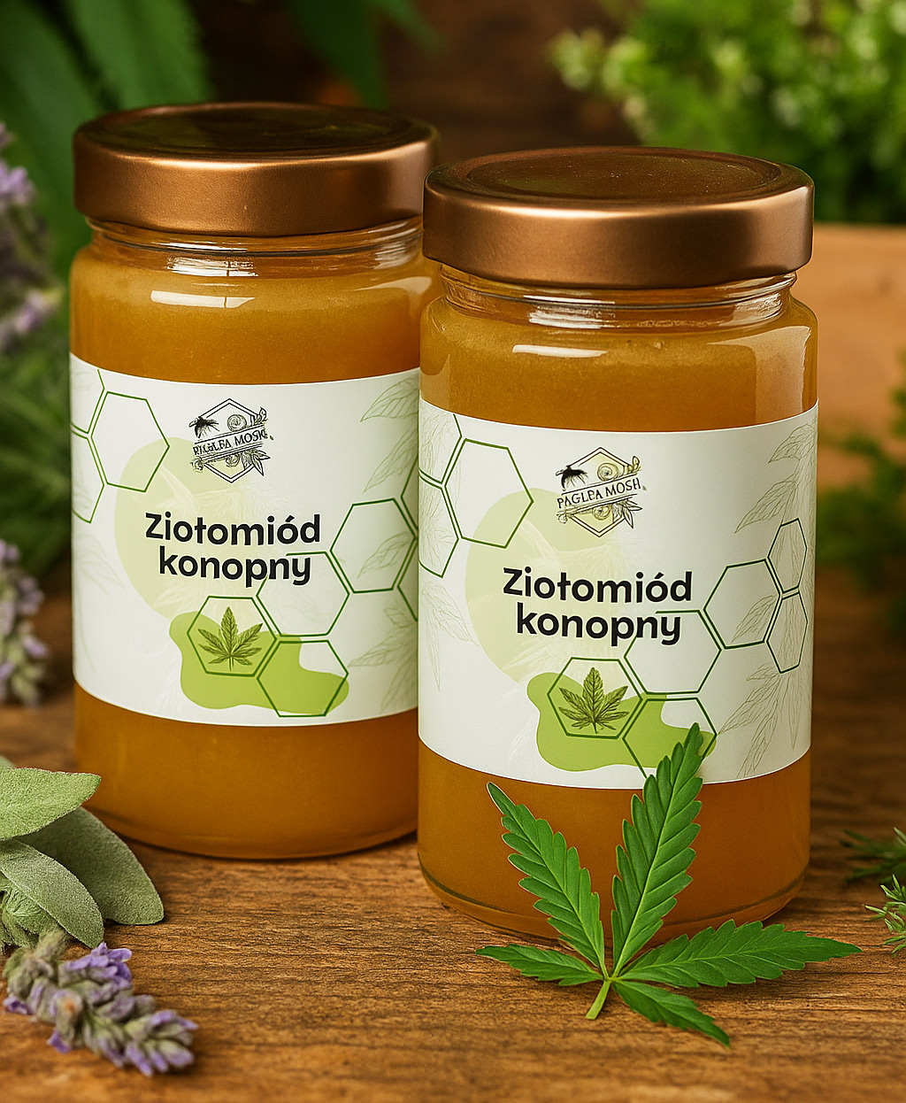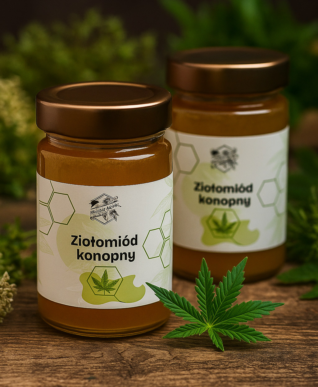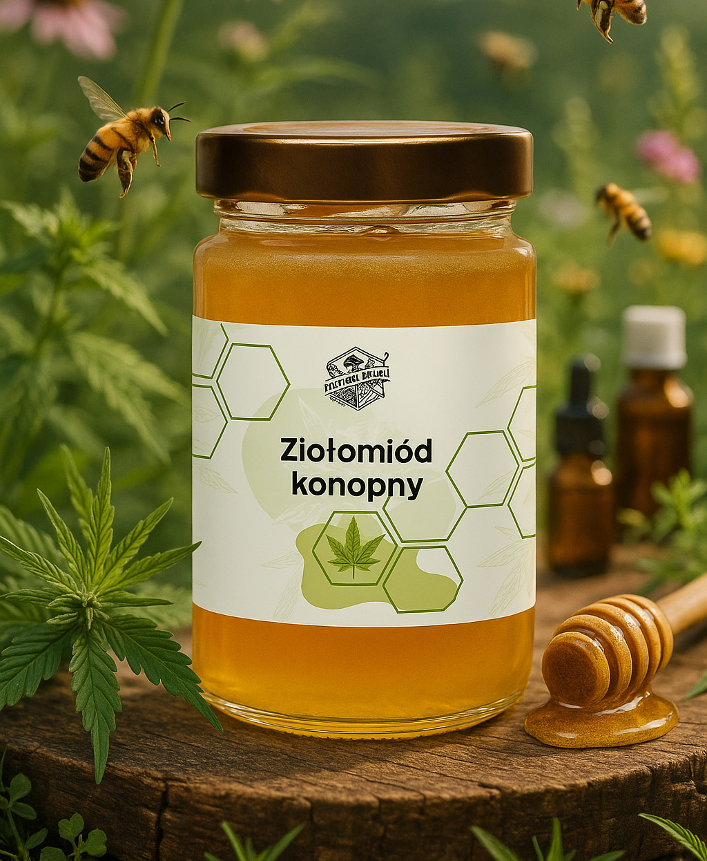 Ziołomiód konopny został wytworzony przez pszczoły, którym podaliśmy syrop na bazie m. in. miodu oraz szczytów konopi siewnej, rosnącej na naszej mini plantacji nieopodal pasieki.